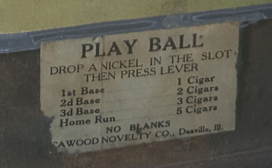 I am only aware of two examples of this machine, and the graphics are much brighter on this one than the other. The sport of baseball was just gaining traction as America's Game at the time Cawood brought Play Ball to market. Sports theme trade stimulators in general were not prominent until the 1930s, making Play Ball that much more unusual. It is a bit suprising that this machine operates on a nickel. Most machines of the time period were penny operated, so five cents was quite a sum. But alas, virtually every play was rewarded with a least one cigar, so perhaps it was not so bad. The example shown here is original with the exception of a replacement spring or two inside. |